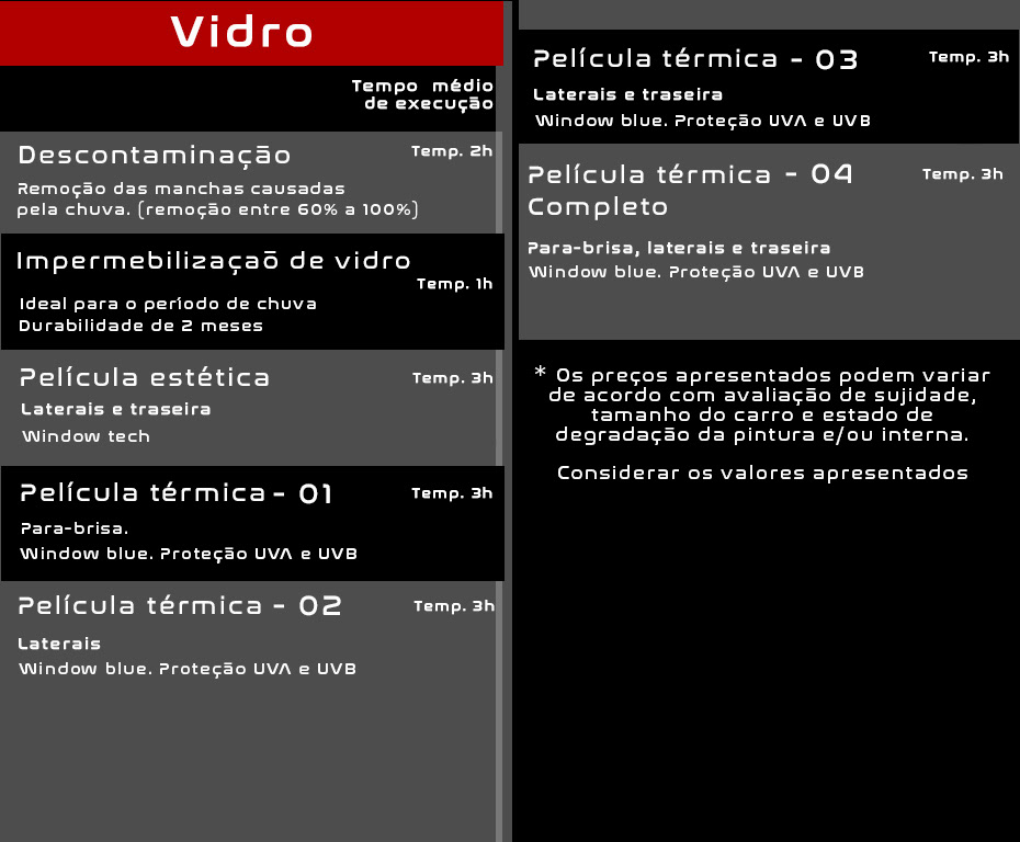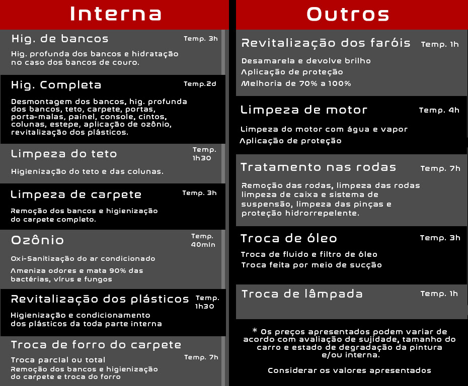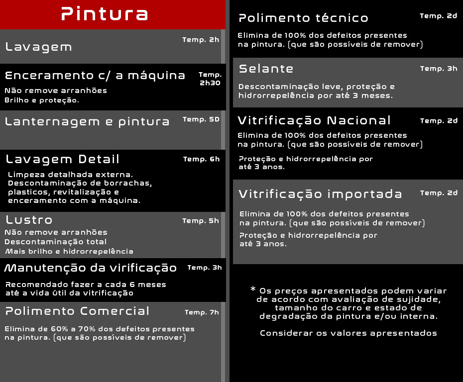 Tamanho do veículo, nível de contaminação e degradação são fatores decisivos para precificação do processo e a indicação do melhor procedimento a ser feito. Indo sempre de acordo com a necessidade e nível de exigência do cliente.